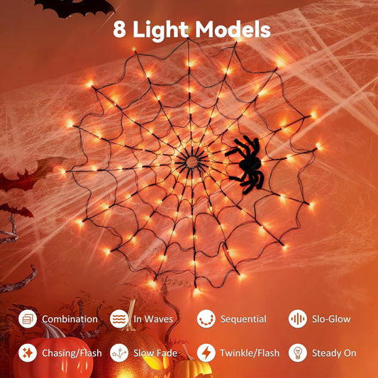 Halloween Decorations Spider Web Lights - 4FT Diameter 70 Leds Halloween Light Waterproof with Remote Control 8 Modes for House Garden Wall Party Decoration, Purple Orange
